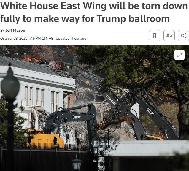 路透社指出,美国最具历史意义的建筑之一已被部分拆除,引发许多民主党人的愤怒抗议,并促使特朗普政府采取行动。它质疑是否遵循了正确的程序。白宫驳斥了这些批评,称其为“捏造的愤怒”。